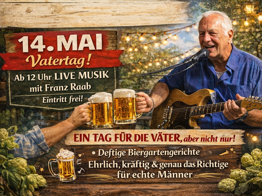 Do - 14. Mai 2026 ab 12:00 Uhr Vatertag 2026 Ab 12 Uhr Live Musik mit Franz Raab. Eintritt frei! mehr lesen teilen per Facebook per Twitter per Google+ per E-Mail
